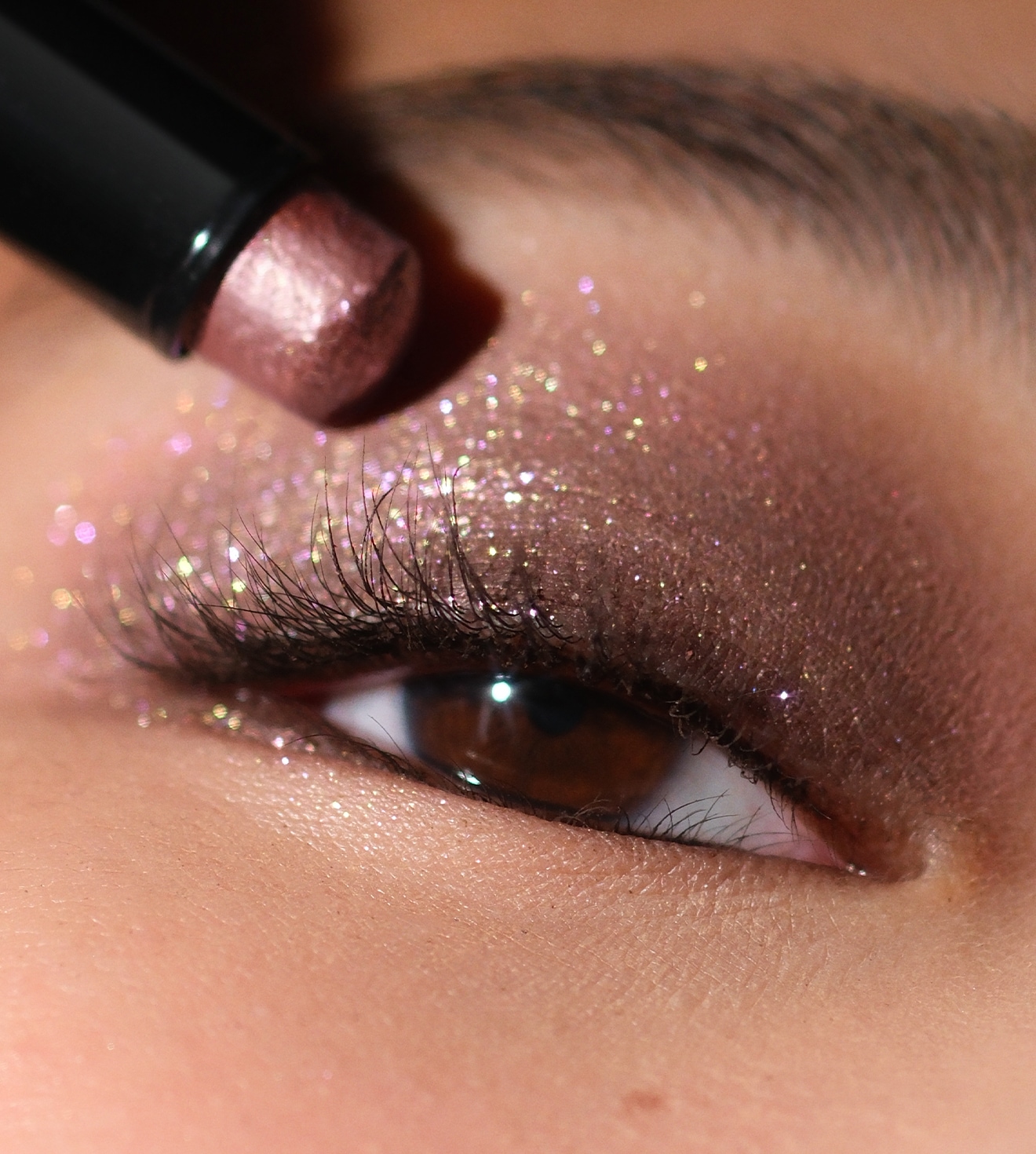 To get this sparkly eye makeup look, start with Long-Wear Cream Eyeshadow Stick in Bark, then layer Crystal Eyes Shimmer Eyeshadow Stick in Brilliant Pink.
